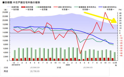例として首都圏中古戸建の推移をご覧いただきますが、薄紫色の「在庫件数」が黄色い矢印で示している通り減少していることがわかります。