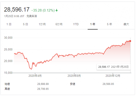 2021年1月25日現在の日経平均は、28,596円。これは、コロナ前をも大幅に上回る水準です。2020年3月に一時16,000円台にまで暴落した株価は、1回目の緊急事態宣言解除を皮切りにぐんぐん上昇しています。
